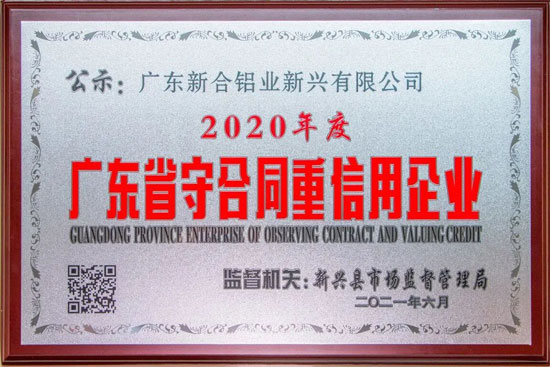 在建黨100周年即將到來之際,新合鋁業再度傳來喜訊,公司憑借在社會上的良好信譽、建立起規范完善的合同管理和服務流程體系,榮獲2020年度“廣東省守合同重信用企業”榮譽!