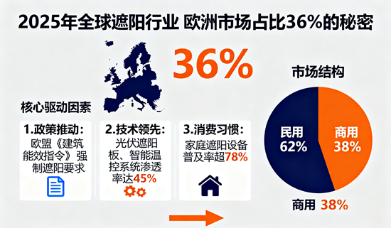 2025年,全球遮陽行業迎來新一輪增長浪潮,市場規模突破千億美元大關。在這場全球競爭中,歐洲市場以36%的份額穩居榜首,遠超北美、亞太等經濟體。這一數字背后,是歐洲對建筑節能、綠色生活與智能技術的系統性布局——從政策強制推動到企業創新引領,從建筑標準革新到消費文化滲透,歐洲正以“全鏈條生態”重構遮陽行業的全球競爭格局。