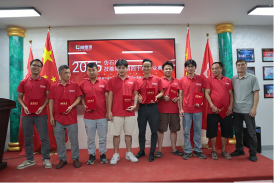 在為期3天的沉浸式培訓中,林德漆技術團隊圍繞“玉彩石、彩釉石、冠晶石、石灰巖”四大仿石漆品類,深度解析了拱包石、筑模條、深槽雙邊等最新工藝的施工精髓。國家高級工程師現場拆解工藝流程,從基材處理到紋理塑造,從色彩調配到質感呈現,每一個環節均強調“毫米級精度”的工匠精神。參訓學員通過實操演練,不僅掌握了仿石漆的標準化施工體系,更在創新工藝應用中突破傳統邊界,為高端建筑外立面定制化需求提供了全新解決方案。