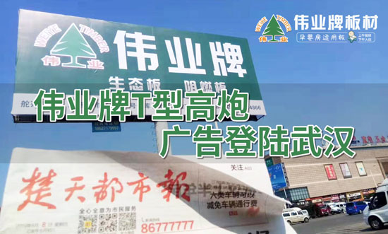 板行業的競爭日益激烈,品牌競爭已經上升到品牌推廣的水平,為此,偉業牌發起了一場大攻擊。武漢建材市場有一個巨大的T型高炮廣告,它位于優越的地理位置,人群密集,廣告圖片制作精良,以綠色為基調,大氣醒目,視野開闊。這不僅凸顯了偉業品牌環保和高端品牌形象的質量內涵,還增加了與消費者和預定客戶的聯系點,從而促進了武漢終端銷售渠道的發展。