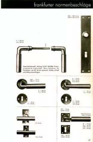 Wehag公司發(fā)布了戰(zhàn)后第一本訂貨樣版。該樣版歷經(jīng)MaxBurchartz(馬克斯?布查斯)的再次策劃,在日后很長(zhǎng)時(shí)間里明確了公司的形象。樣版中,經(jīng)典現(xiàn)代執(zhí)手風(fēng)格的那些整齊的幾何形狀執(zhí)手樣式慢慢消失,取代的是五十年代各種各樣曲線風(fēng)格的執(zhí)手。