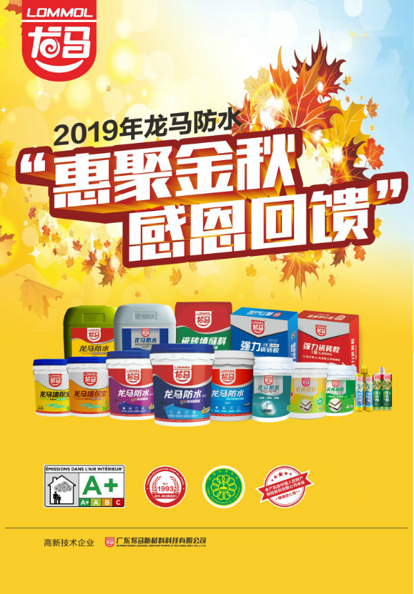 據悉,2019“惠聚金秋”主題活動將持續至12月上旬,而主題活動政策也是優惠至今年12月30日。這時的龍馬防水材料正繼續前行,擴大勝果,獲取更為輝煌的明天,為2019年劃上一個完滿的句號!