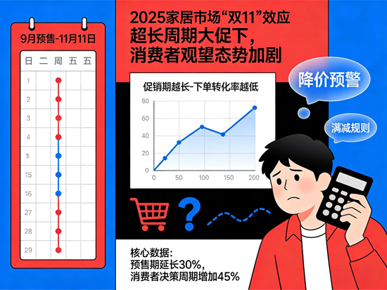 2025年的“雙11”購物節(jié),在家居市場掀起了一場前所未有的變革浪潮。這場原本以集中爆發(fā)式促銷為特征的傳統(tǒng)消費(fèi)盛宴,在超長周期大促模式的推動下,呈現(xiàn)出與以往截然不同的市場態(tài)勢。消費(fèi)者觀望情緒的加劇,不僅重塑了家居市場的競爭格局,更深刻反映出消費(fèi)升級與市場轉(zhuǎn)型的深層邏輯。