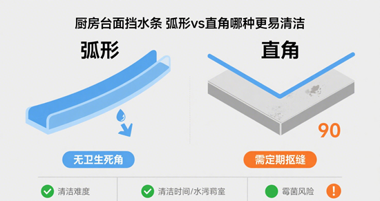 再看近年爆火的“弧形擋水條”,也被稱作“圓弧收邊”或“一體打磨邊”。它的精髓在于——沒有棱角!臺(tái)面與擋水條通過專業(yè)打磨,形成一道流暢的R角曲線(通常R≥5mm),水珠油污無處可藏,抹布一推到底,連衛(wèi)生死角都“失業(yè)”了。